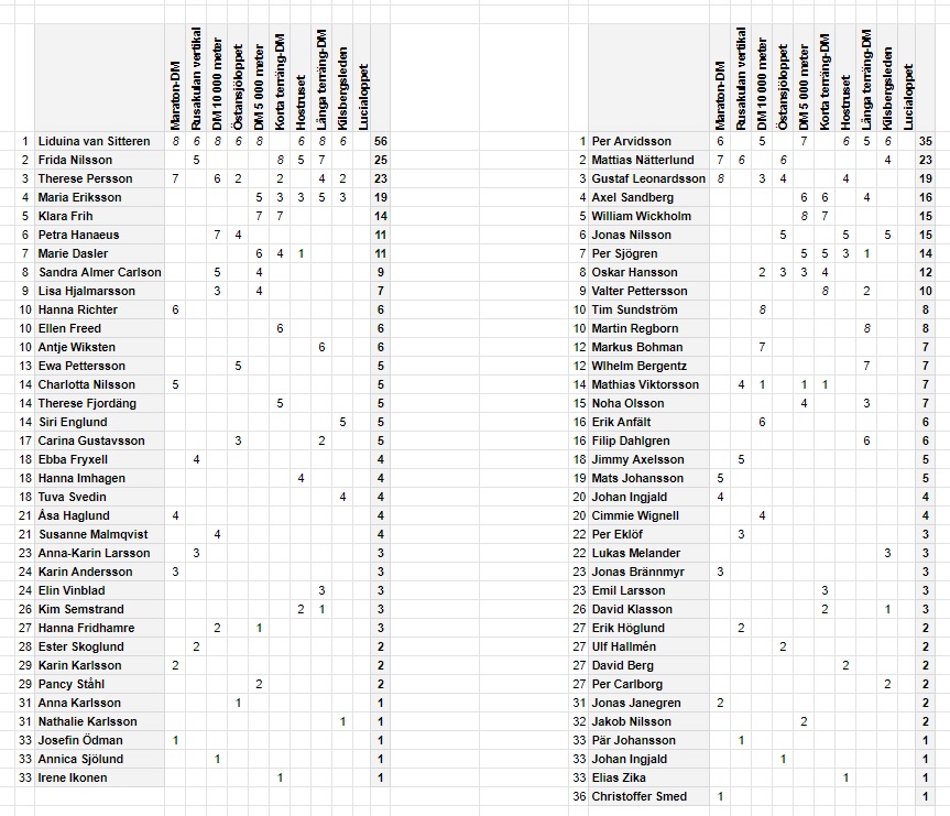 På herrsidan visade Per Arvidsson att den fina höstformen är fortsatt stark och följde upp segern i Hostruset (och fjärdeplatsen, mot väldigt starkt motstånd, i långa terräng-DM) med en övertygande vinst på 50.32, över minuten före Jonas Nilsson (som var tvåa även i Hostruset) på 51.45 och med Mattias Nätterlund som trea på 53.05. Segern hade säkrat Arvidssons tredje raka vinst i långloppscupen, om den inte hade skrinlagts på grund av för få tävlingar (van Sitteren har ju sedan tidigare säkrat segern på damsidan; hon har sprungit alla tävlingar utom korta terräng-DM i år och vunnit samtliga). Jag har egenhändigt räknat ut ett sammandrag inför finalen i Lucialoppet om en månad (om den nu blir av, annars är det här slutställningen), och den enda coronaanpassningen jag gjort är att jag tagit bort kravet på att man ska ha sprungit sex tävlingar för att få motta pris (i normala fall hade Frida Nilsson och Mattias Nätterlund, som bara sprungit fyra, till exempel inte fått motta andrapriserna även om de försvarar positionerna i Lucialoppet).