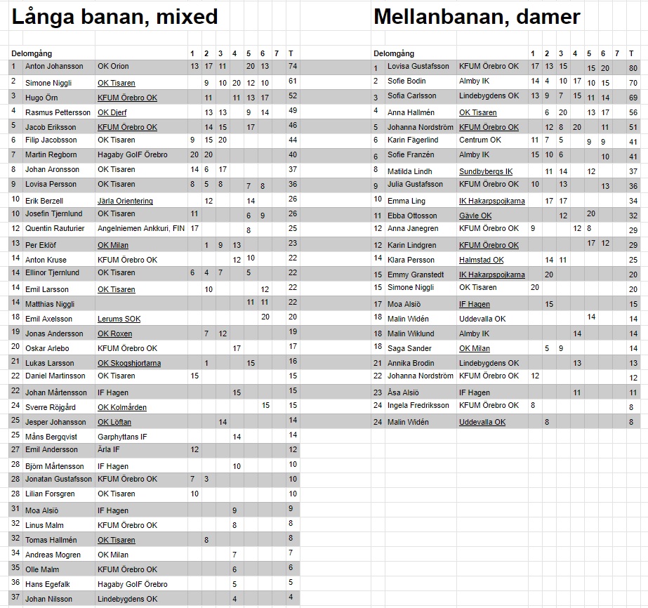 Ännu tajtare var det i herrarnas yngre juniorklass där fem löpare var inom tio sekunder och tolv inom minuten bakom segrande Edvin Nilsson, Långhundra, efter nästan 80 minuters orientering (man kan ju fråga sig hur mycket somliga i kön verkligen orienterade, men nu för tiden är det ju helt tillåtet att bara hänga). KFUM Örebros Hugo Örn var med i tåget och slutade åtta, bara 21 sekunder från guld och 15 från medalj. Karin Lindgren slutade 15:e i D18 och Anton Kruse blev 24:a i H18.