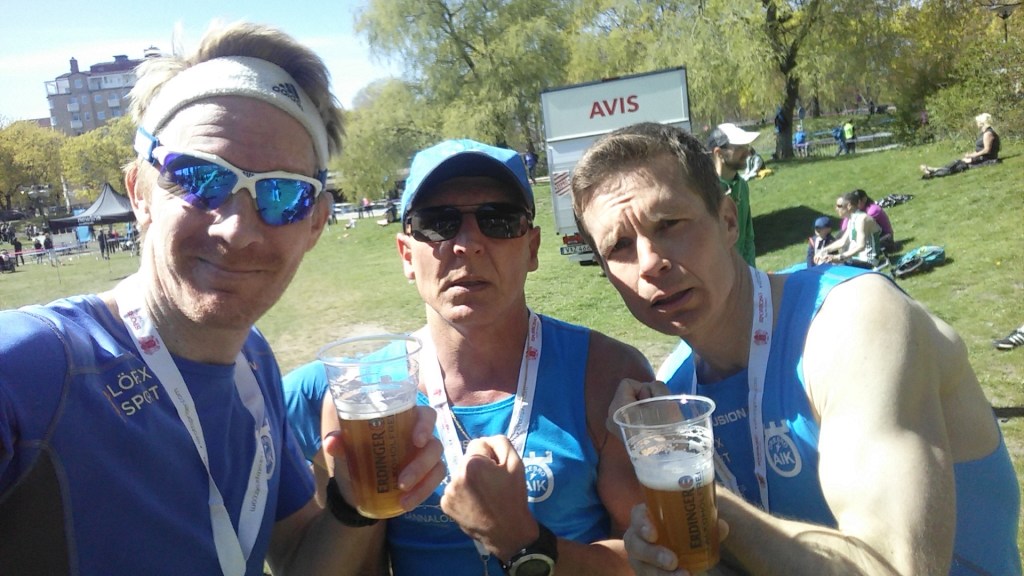 Örebro AIK-trion Fredrik Johnsson, Anders Larsson och Ludvig Börjesson njöt kall men alkoholfri öl efter målgång på Kungsholmen. Foto: Privat