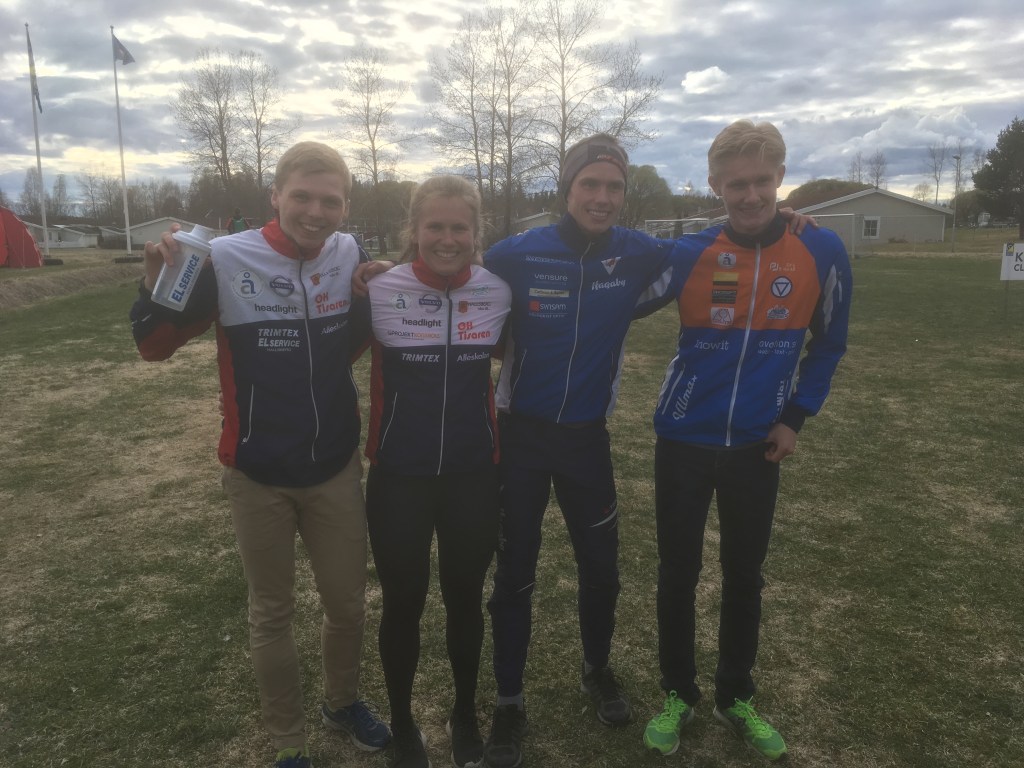 En bild som Oskar Andrén bjusar på från i fredags – fem länslöpare som var topp fem i elitseriesprinten i Bollnäs: Filip Jacobsson (femma H20), Lilian Forsgren (femma), Martin Regborn (tvåa), Jonatan Gustafsson (femma H18, alltså samme Gustafsson som sprungit så bra på medeldistanstävlingarna i Inneserien i vinter). Foto: Oskar Andrén