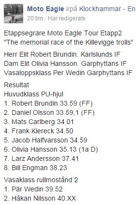 Fler resultat och lite text från premiären i Moto-Eagle tour, som jag skrev en blänkare om i går, kan ni läsa på den här länken! Nästa deltävling onsdag 27 maj.