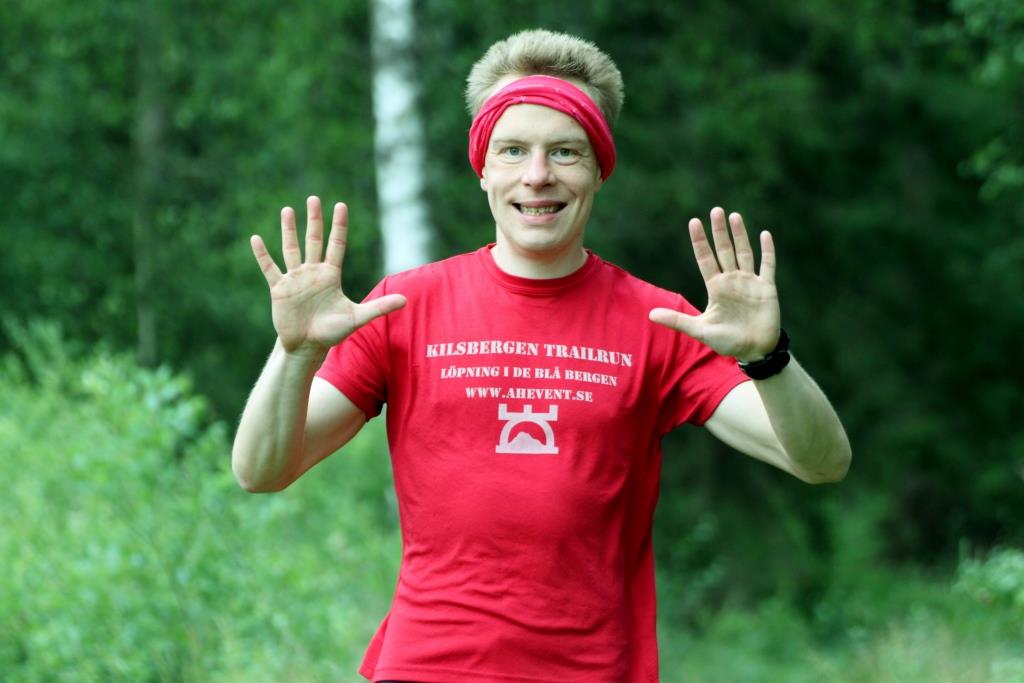 Varv 13 avklarat och klockan närmar sig 23 (tio fingrar för tio plus tre, men de tre andra kom inte med på bild …). Notera schyssta pannlampefrisyren! Foto: Maria Åström