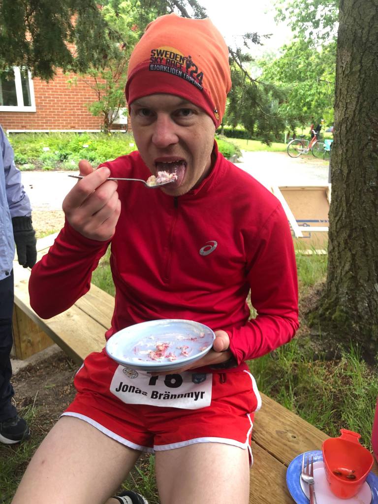 Jag hade läst startlistan inför loppet noga och siktade på en andraplats bakom Alfons Enell, en ultralöpningssensation från Tranås som 17 år gammal i fjol kom tvåa bakom Jonathan Kandelin här på leden och som sedan dess fyllt 18 och sprungit över 80 kilometer i ett sextimmarslopp (alltså en bra bit över min egen kapacitet). Enell, cool i sin stråhatt, visade sig dock ha dragits med förkylning, och tog det lugnt och lade sig bakom mig och släppte. Men många andra dunkade på. Fattade inte det i början, men när jag kom ned till Bergslagsledens för året nya etappmål i Lekhyttan (en omdragning som gjort leden 900 meter kortare, och de tre loppdistanserna 1 800 meter kortare) var jag bara femte man som fortsatte mot Stenbäcken och Sixtorp (i Lekhyttan vänder de som ska springa 45:an). Foten kändes ungefär som efter start, varken bättre eller sämre, lite jämn smärta på varje steg, men jag var fräsch i övrigt och fortsatte. Tog en naproxen och en alvedon och åt kall korv-risgrynsgröt uppför backen mot Lekhytteklint (det var min enda energi för dagen, utöver 40 gram choklad och sportdryck som jag drog i mig nästan tre liter av).
