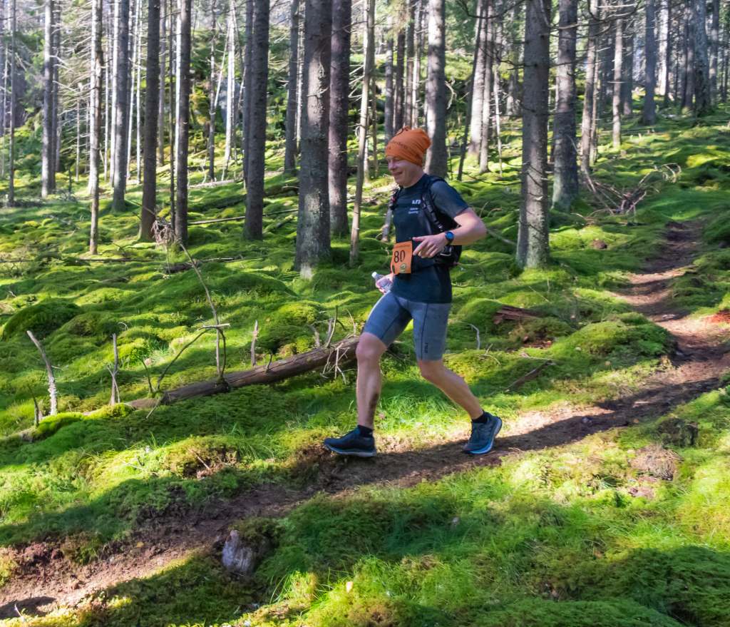 Kunde hålla någon sorts löpsteg uppför den långa grusvägsbacken på vägen tillbaka mot Lekhytteklint och kom om en amerikan vid det stora myrstackarna i skogen. Tjoade. Fick mer sportdryck (och lite blåbärssoppa) på vägen ned mot Lekhyttan, och pappa sa det passerat en kille bara några minuter senare som ”såg ut som om han sprungit långa”. ”Inte en chans”, tänkte jag som bara kände mig jagad (även om jag nu fått höra att Alfons tvingats bryta – riktigt tråkigt, för att ta stryk av en sån kille hade jag inte haft några problem alls med), men nere vid energibordet stod Janjam och fyllde på. Han blev nog lite stressad av att jag bara sprang förbi med highfives till hejaklacken och ett hej till funktionärerna, för han skyndade sig iväg direkt och försökte rygga på asfalten, men jag drog på lite extra både där och uppför starten på ”Brännmyrbacken”, som ledens nya sträckning upp mot Stora Tväggelåten döpts till. Här började energin rinna ur mig, men jag delade upp vägen som var kvar i små, små segment (jag kan i princip varje sväng i huvudet efter många turer på leden) och försökte mata på. Det var lite lerigt, men härligt. Vädret var perfekt hela dagen, för övrigt. Tio-tolv grader och höstsol med växlande molnighet.