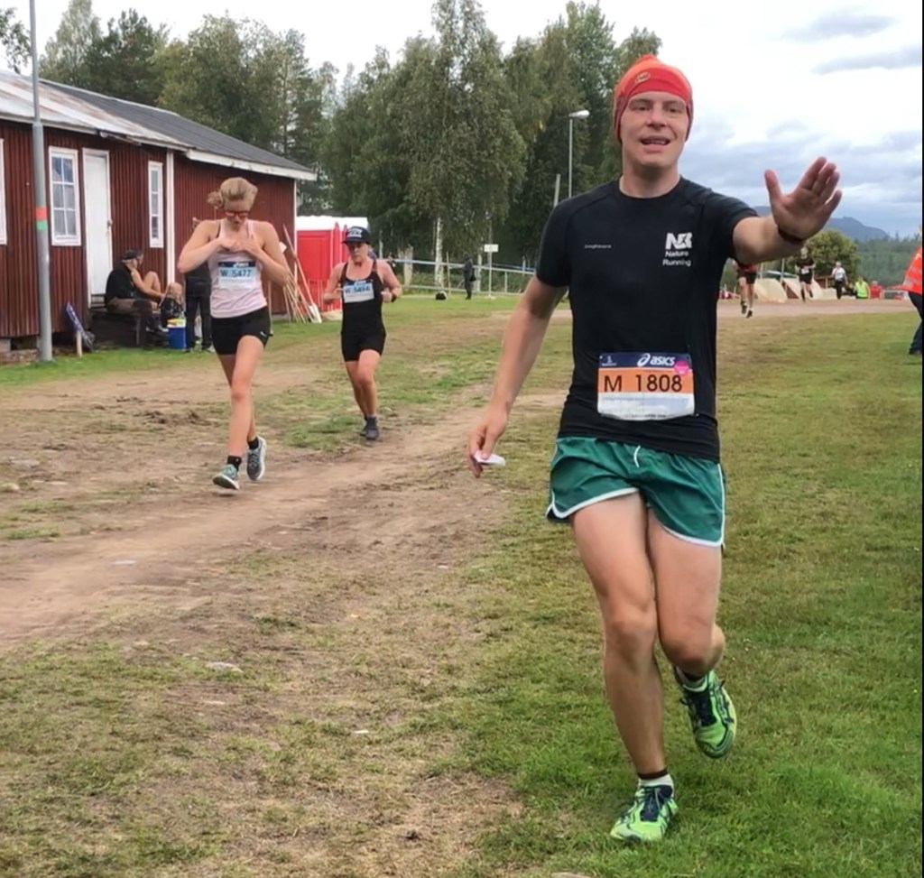 Så jag grävde djupt. Tog kilometer för kilometer (redan från start hade jag en regel om att jag bara fick kolla gps- och pulsklockan vid kilometerskyltarna, en regel jag satt upp för att jag skulle kunna njuta mer av loppet och inte bara springa och kontrollera mig). Farten mattades något, visst. Men 5.44-snitt mellan Oxberg och Hökberg gjorde ju ändå att bufferten mot 8.41 växte snarare än krympte, och sedan väntade nedförsbacken (som förvisso i det här skedet av loppet inte är skönt för musklerna, men likväl bra för tiderna) mot Läde. Och efter några platta men mentalt jobbiga kilometer i den vackra tallmon stod hon där, Maria, och eldade på mig. Berättade att jag var 47:a i Hökberg och såg mycket piggare ut än ”alla andra” med orangea nummerlappar framför. Dagens finaste ögonblick. Tävlingshornen växte ut. ”Jaja”, tänkte jag. ”Jag försöker väl då.” Så istället för att fortsatte tappa tempo provade jag att öka, igen. Och kroppen svarade, igen. Jag la i 5.30-tempot och rullade ned till Eldris. Speakern ropade att gubben som kom in bakom mig var 43:a. Ut från kontrollen passerade jag tre löpare med tydliga krampkänningar, vilket med snabb huvudräkninge borde göra mig – som drömt om en topp 100-placering – till 39:a i det läget.