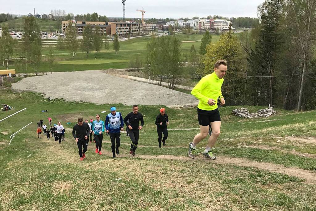 Själv var jag också ute och sprang i terrängen i går, men utan karta. Team Nordic Trails Örebroavdelning arrangerade sin del i Höjdmeterskampen, en intern tävling mellan löptränings och -researrangörens olika orter om vilka som kan samla flest höjdmeter på 15 minuter. Det handlar helt enkelt om att locka så många löpare som möjligt till ett gratis träningspass, och sedan få dem att springa upp och ned för en backe så många gånger som möjligt. Och när jag fick lite tid över efter jobbet åkte jag givetvis till Sörbybacken och hjälpte till. Tolv vändor lyckades min sargade och motsträviga kropp klämma ur sig (de första fyra–fem strax under minuten per varv, de sista en bra bit över …), och det bidrog med 264 meter i kampen där vi, ett drygt 30-tal löpare, totalt lyckades skramla ihop 316 varv i backen för totalt 6 952 höjdmeter (ingen Mount Everest, alltså, som arrangören hoppats på på förhand, men bara nio meter från ett Aconcagua [världens högsta berg utanför Asien]). Jag fastnade också på en bild, som jag lånar från arrangörens facebooksida: